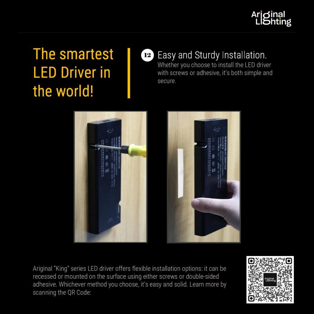 The Ariginal “King” Series LED Driver is engineered for full compatibility with both wireless and wired lighting systems. Uniquely designed to support both systems simultaneously, it allows you to connect wireless controls and traditional wired switches to a single driver at the same time. This enables seamless operation, where both systems can function together, offering unparalleled flexibility and control in your lighting applications.